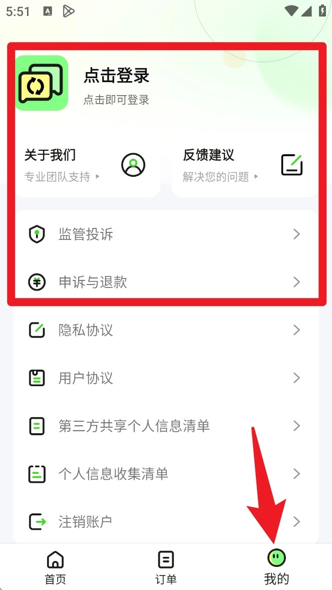 在「我的」页面能够完成登录、查看协议条款、提交退款申请或者反馈建议等与账户相关的操作。