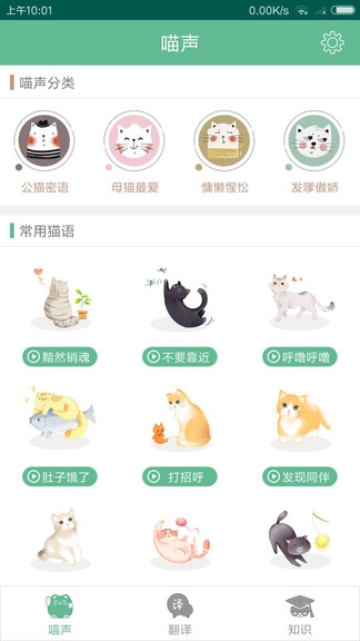 配备猫咪的喵星人语言,比如:委屈、开心、无语、呜咽、去打针、愤怒、发狠等多种有趣的猫叫声,帮您了解猫猫的常用语言,才能了解了它的心情哦!