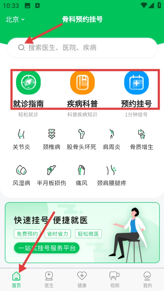 2、首页顶部搜索栏可查找医生、医院、疾病,就诊指南助患者轻松就诊,疾病科普传递骨科病知识,预约挂号实现快速挂号,底部可切换首页、医生等导航栏。