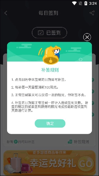 2、截图界面中日历内的许多补是什么意思,这些有写着补字的日期都是因为当天用户并没有进行签到,软件会给予用户补签的机会,但补签也是有条件的:每补签一天需要花费100的阳光,并且之前补签不能获取到每日的签到阳光,但会如同日常签到一样计入连续签到天数。
