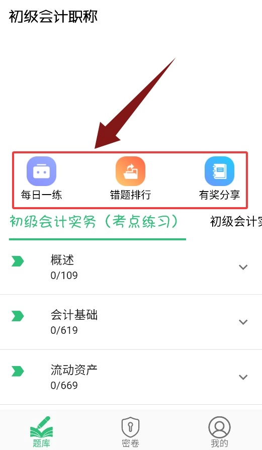 2、题库界面配备了每日一练、错题排行以及有错分享等功能。