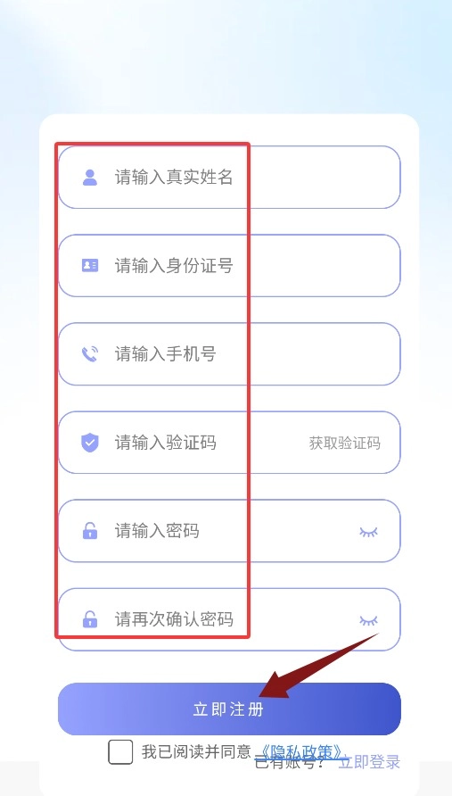 在登录页面点击“立即注册”按钮,就能进入账号创建页面。
