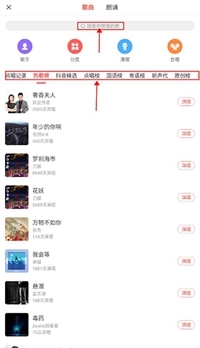 2、接着就能进入歌曲朗诵界面,界面下方的热歌榜里有各式各样的歌曲可供挑选,要是想找特定歌曲录制,也可以点击上方的搜索框输入歌名。