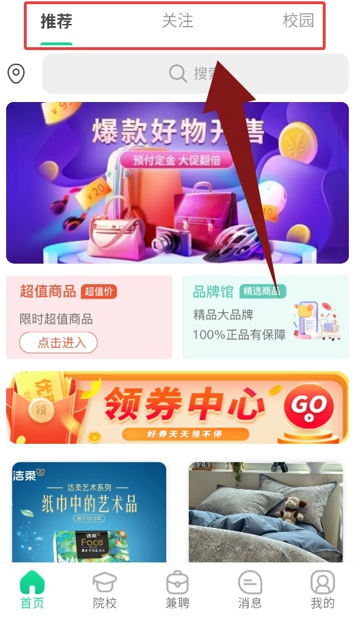 首页设有推荐、关注、校园等栏目,方便用户快速浏览内容。