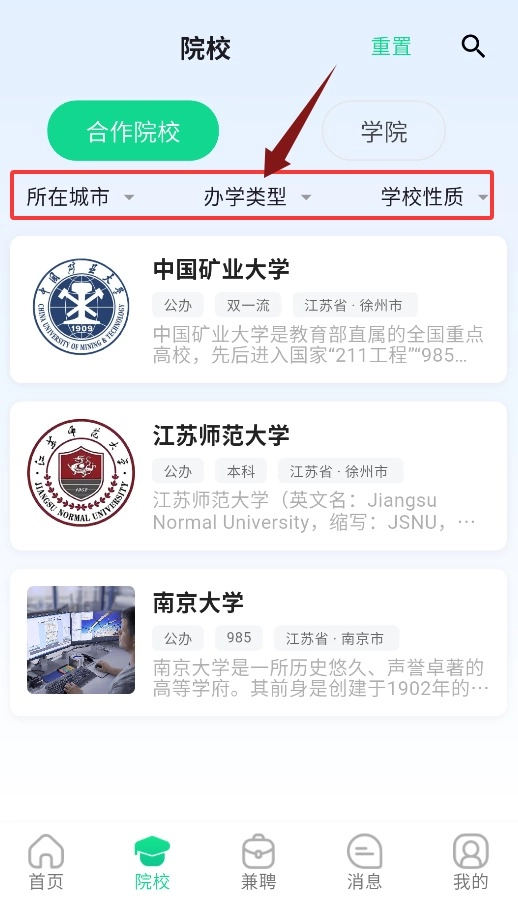 3、院校界面支持依据所在城市、办学类型、学校性质等条件进行筛选。
