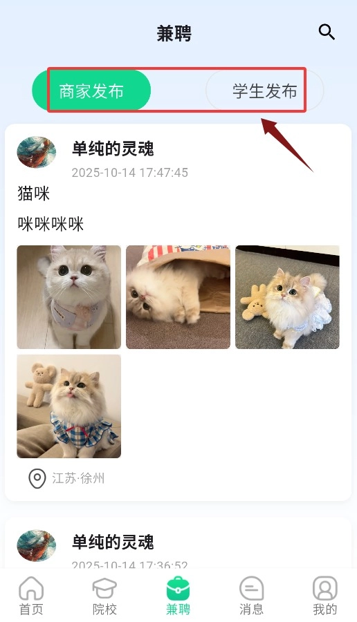 4、兼聘界面呈现商家发布和学生发布的两类兼职招聘信息。