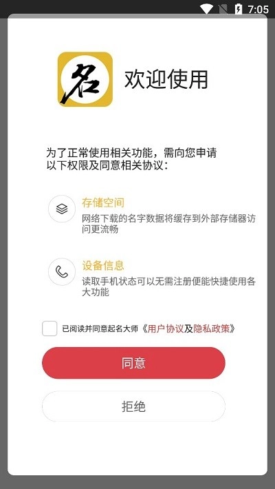 1、首先在本站找到起名大师并进入软件,进入软件后,勾选用户协议和隐私政策,点击同意按钮