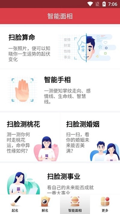 4、智能面相界面为用户提供扫脸算命、智能手相、扫脸测桃花、扫脸测婚姻、扫脸测事业等功能。