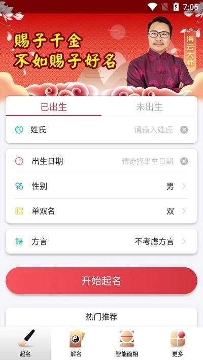 2、进入软件的起名界面后,系统会为用户提供已出生和未出生两种起名选项。用户只需输入姓氏、日期、性别、单双名等必要信息,随后点击“开始起名”按钮,即可完成起名操作。