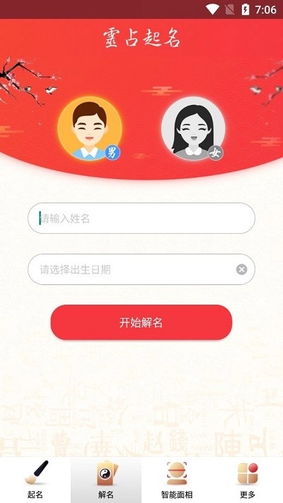 3、进入解名界面后,只需输入男女双方的姓名与出生日期,就能完成解名操作
