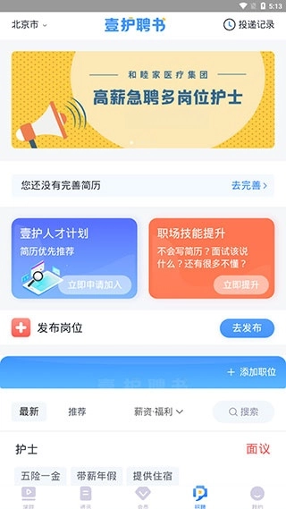4、【招聘】页面为我们呈现了海量的护士招聘岗位,用户完善简历信息后即可着手投递。