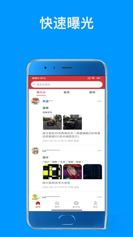 随手拍是一款十分好用的抓拍软件,十分适合道路违章拍摄使用,软件拥有强大的装拍系统,能够把不遵守交通规则的行为快速拍摄下来,方柏霓用户更好的管理和批评处理,也可以拥有道理检测,方便用户了解乱停车现象。