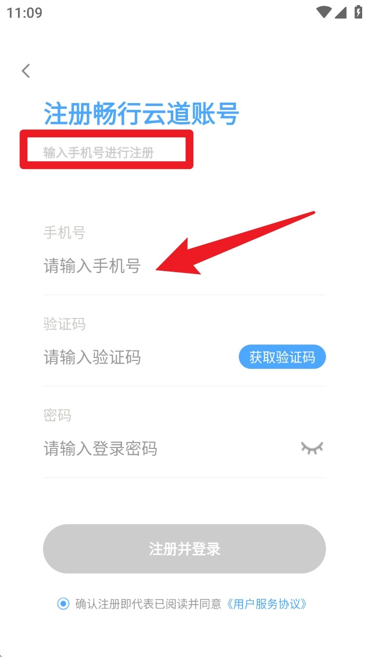 1. 打开App后,找到并点击“注册畅行云道账号”的选项,依次输入手机号、验证码和密码,完成后提交注册信息。