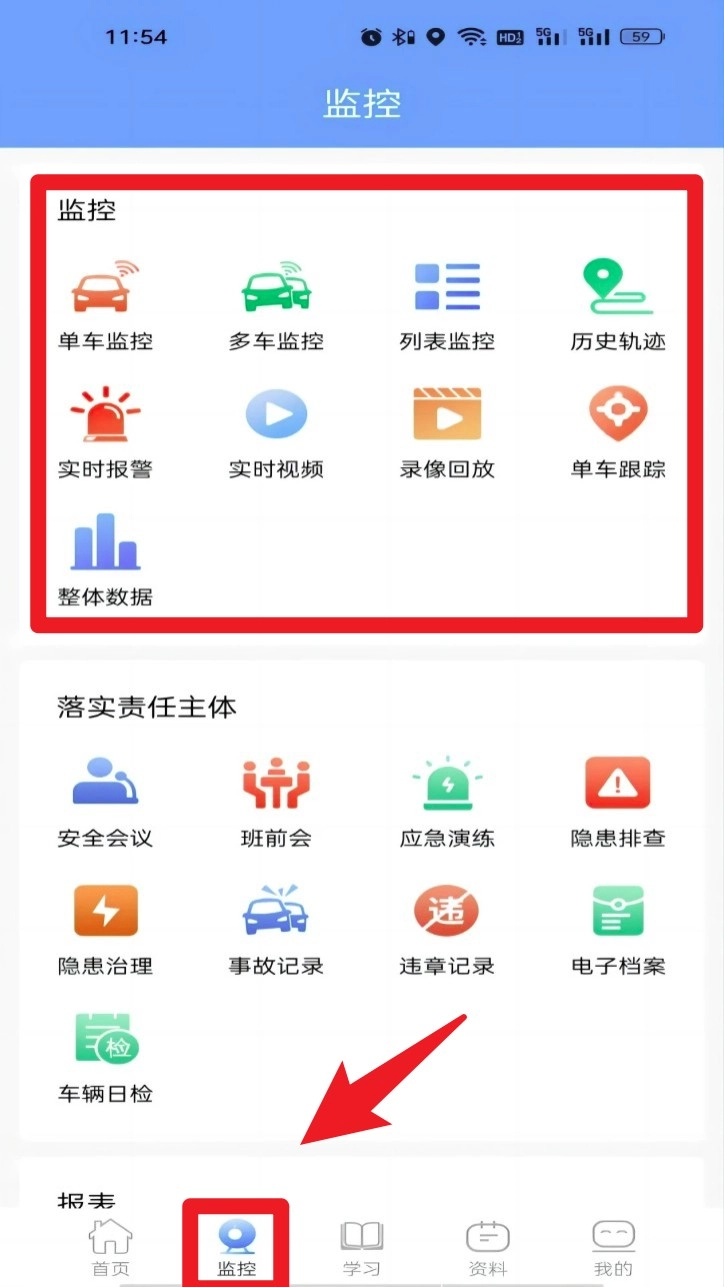 3. 登录成功后,点击页面底部的监控按钮,进入车辆监控板块,在此可以查看实时视频、轨迹回放等相关信息。