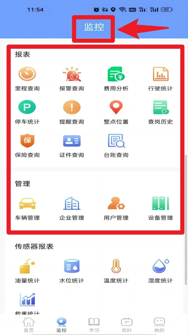 4. 在监控页面向下滑动,即可查看报表区与管理区,这里支持报警查询、费用分析、台账管理以及设备管理等功能。