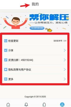 1、打开App进入“我的”页面,能查看当前版本、用户协议、检查更新、意见反馈以及相关设置选项。