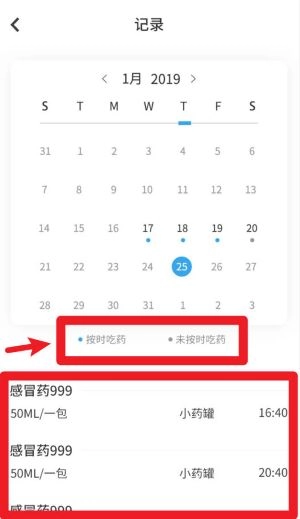 2、点击底部导航栏的“记录”选项,进入日历界面即可查看每次服药情况,其中蓝点代表已按时服药,灰点则代表未按时服药。