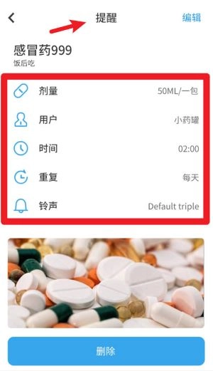 3、点击任意一条提醒记录,即可查看其详细信息,涵盖剂量、用户、提醒时间以及重复设置等内容;同时,也能够点击编辑按钮来修改提醒内容。