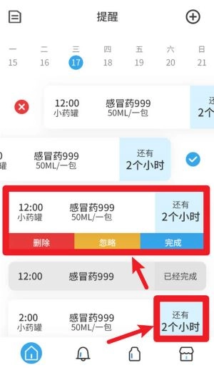 4、进入提醒页面后,能查看每日的用药安排,该页面支持通过滑动来完成操作或删除记录,同时还可以清晰显示距离下次服药的剩余时间。