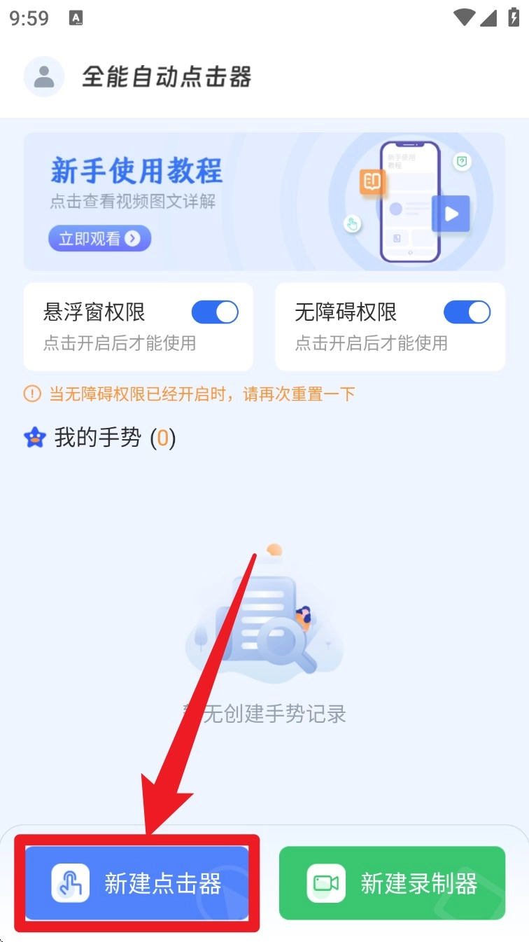 2. 开启权限后,点击底部的新建点击器按钮,即可着手设置自动点击的事件流程。
