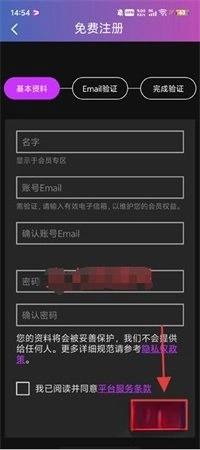 在注册页面填写你的邮箱账号等相关信息,接着点击完成注册按钮。