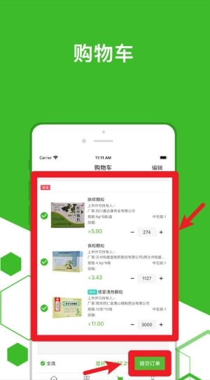 2、浏览药品后添加至购物车,进入购物车页面能够调整购买数量,确认无误后点击底部的提交订单按钮。