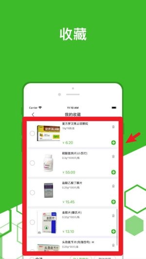 3、在收藏页面能够查看已收藏的药品,点击右侧的加号图标,就可以直接把药品添加到购物车中进行采购。