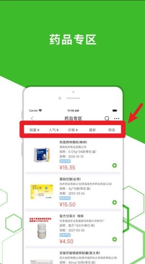 4、进入药品专区后,利用筛选功能,能够按照分类、价格或者热度来查看药品的详细信息,并且可以迅速将其添加到采购清单里。