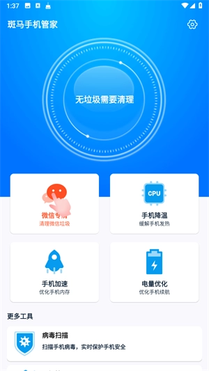 斑马手机管家是一款内存清理软件,能给手机加速、清缓存、杀病毒还能降温,常用的功能基本都有。能优化后台那些没关的程序,让手机少占点内存,用着就不那么卡了。垃圾清理也方便,能把手机里的没用文件都扫出来,操作一点不复杂,手指轻轻点下按钮,手机就能变流畅,平时手机出小问题,用它调理调理就挺管用,不用费劲找别的办法。