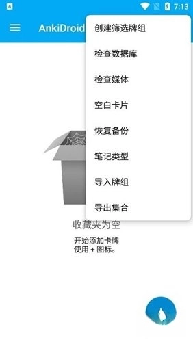 4、点击右上角的三点按钮,这里包含多种功能,如创建筛选牌组、检查数据库、检查媒体、空白卡片、恢复备份、笔记类型、导入牌组、导出集合等。