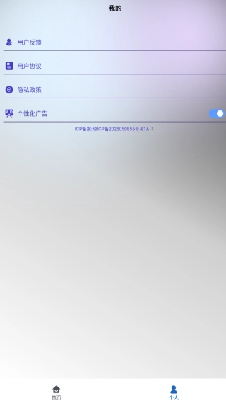 4、进入“我的”模块,可提交反馈意见,同时能开启或关闭个性化广告推送。