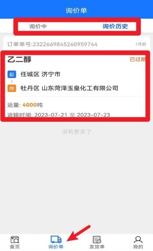 2、登录后点击底部的询价单菜单,系统会展示当前和历史的询价记录,从中可以查看运输的起止地点以及货物相关信息。