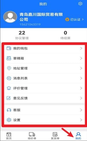 3、进入“我的”界面后,可对个人或企业信息进行管理,还能查看钱包余额、地址信息、历史评价以及系统通知等内容。