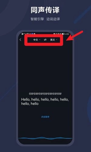 2、点击同声传译后,选择原语言与目标语言,即可开启语音识别与同步翻译。