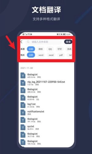 3、如需翻译文档,点击文档翻译,上传本地文件,用户可通过筛选来源与文件格式快速定位需翻译的文档。