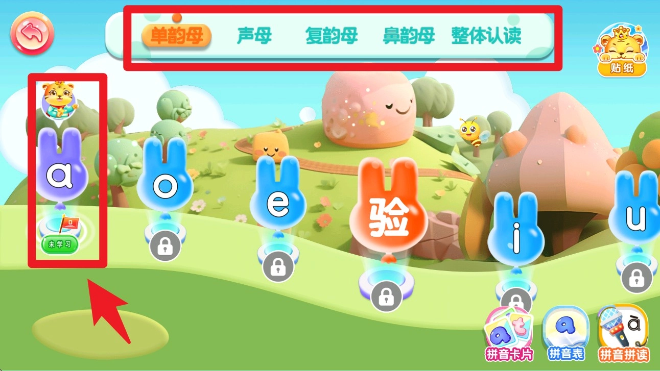 3. 在课程选择页面,孩子能够点击已解锁的单韵母卡片来开启学习,系统会依据学习进度循序渐进地解锁后续的学习内容。