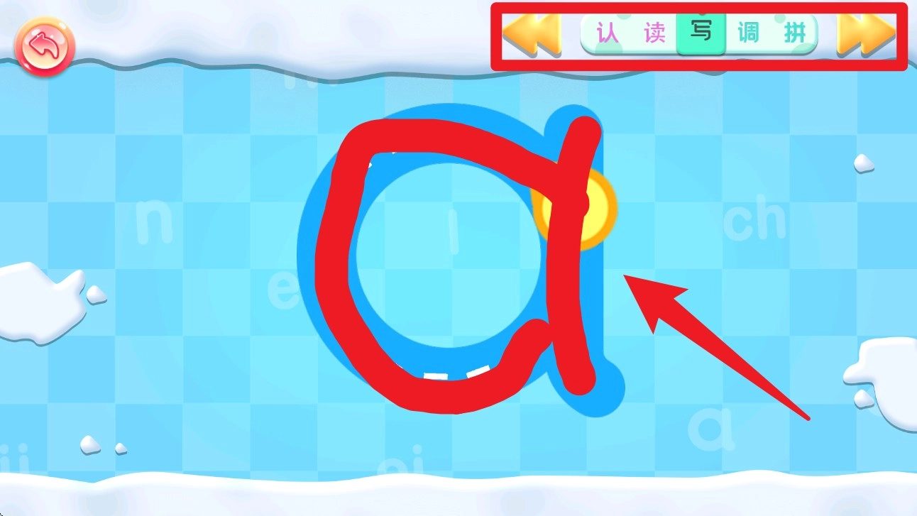 4. 进入拼音书写界面后,孩子能够跟随动画轨迹练习字母的书写顺序,借助手指滑动来完成书写阶段的互动任务。
