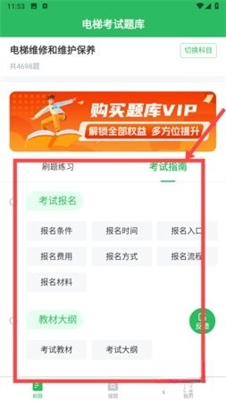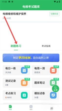 1、聚焦电梯维修与维护保养科目,此科目包含4698道题目,设有刷题练习专区,配备每日一练、每周一测等免费功能,还有考点练习、模拟试卷等内容,助力考生开展有针对性的刷题训练。