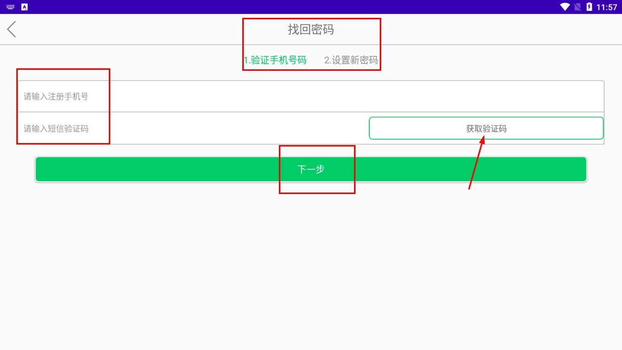 在密码找回页面,填写注册时使用的手机号码,点击“获取验证码”功能按钮,输入收到的验证码后,再点击“下一步”功能按钮。
