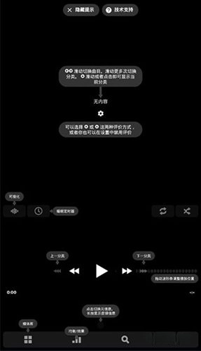 这里是Poweramp的主界面,你可以在此进行滑动切换曲目、多次滑动切换分类等操作,也能通过滑动或点击来显示当前分类。