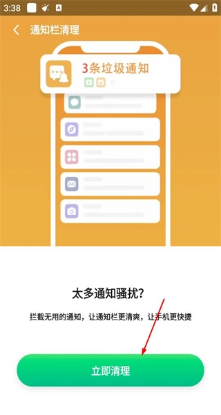 进入通知栏的清理界面后,能看到有3条垃圾通知的提示信息,接着点击页面底部的“立即清理”按钮,就可以对这些无用的通知内容进行处理了。