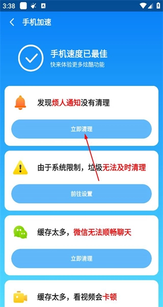 加速完成后,页面提示手机速度已达最佳状态,同时看到未清理的烦人通知提醒,点击对应的“立即清理”按钮,即可进入通知栏清理界面。