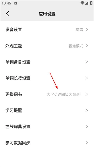 3、在应用设置页面选择更换词书选项,进入切换词书页面。