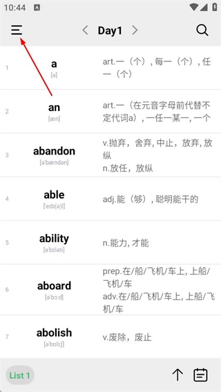 1、在单词页面点击左上角菜单按钮,进入功能页面。
