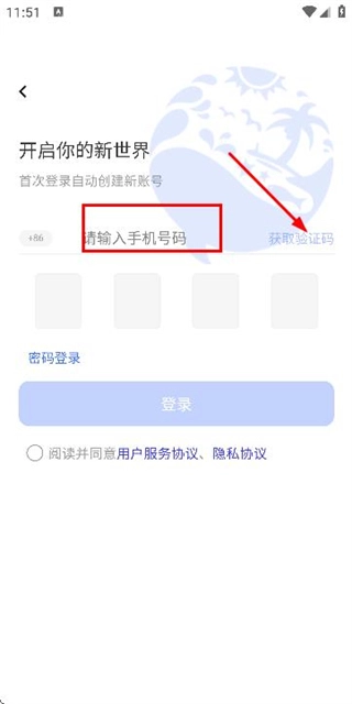 2、在手机登录页面填写手机号,勾选协议后,点击获取验证码。