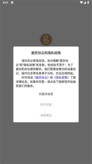 1. 首次使用时,需查阅服务协议与隐私政策,点击同意并接受相关条款。