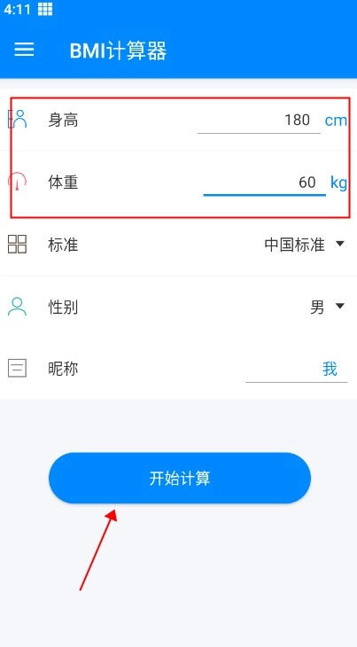 打开后能看到页面十分简洁,只需输入你的身高与体重,接着选择对应的性别,最后点击开始计算按钮即可。