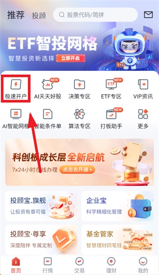 打开粤管家,进入后点击极速开户