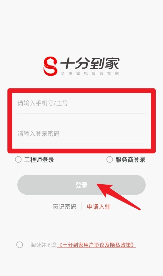 打开十分到家后,首先输入手机号或工号以及登录密码,接着选择工程师或服务商的身份,然后点击下方的“登录”按钮,即可完成登录操作。