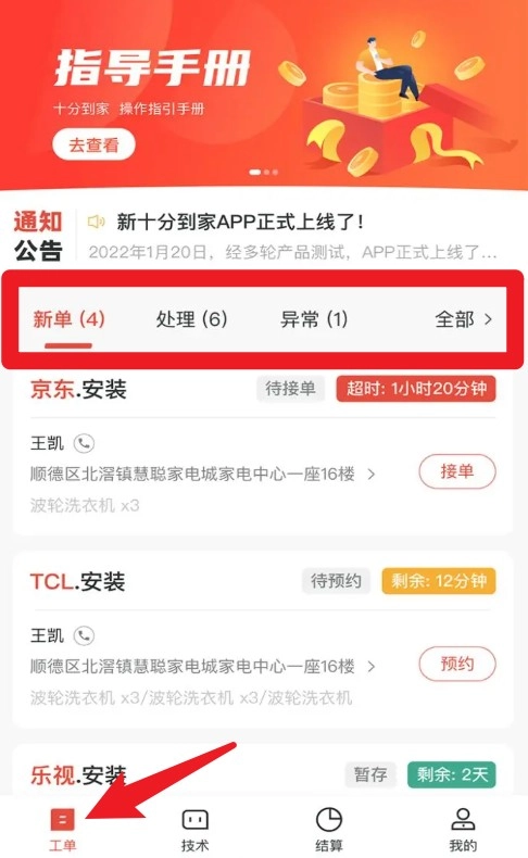 登录成功进入首页后,点击底部的“工单”栏目就能查看任务列表,还可以快速切换查看新单、处理中、异常等不同状态的工单。